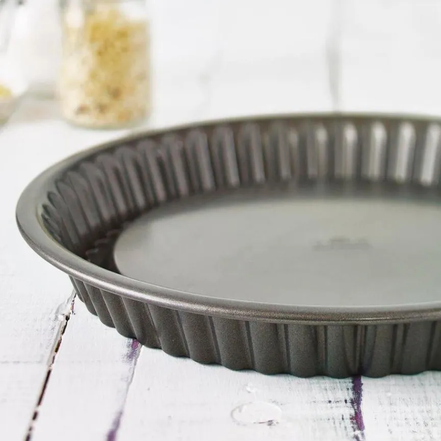 Die Backform Obstboden Easy Ø 30 cm sorgt für perfekte Ergebnisse, denn dank der Antihaftbeschichtung gleitet der Kuchenboden nach kurzem Abkühlen mühelos aus der Form. Darüber hinaus überzeugt sie durch das hochwertige Material, das eine perfekte Wärmeverteilung bietet. Egal, ob Biskuit- oder Mürbteig, mit der Backform Obstboden Easy Ø 30 cm geht nichts mehr schief.