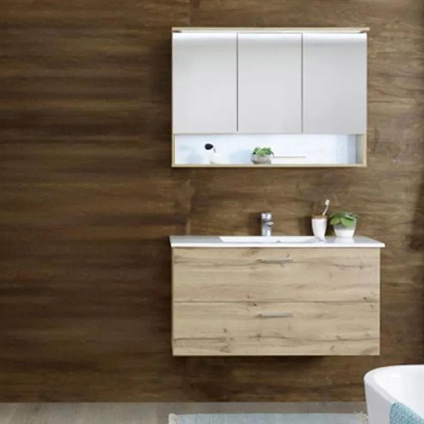 Statten Sie Ihren Sanitärbereich mit der Badkombination Best aus und sorgen Sie für eine geschmackvolle Einrichtung. Sie erhalten einen Spiegelschrank inklusive LED-Beleuchtung, der sich leicht montieren lässt. Zudem bietet Ihnen die Badkombination Best einen Waschbecken-Hängeschrank in eleganter Holzoptik, der mit zwei Schubladen ausgestattet wurde.
