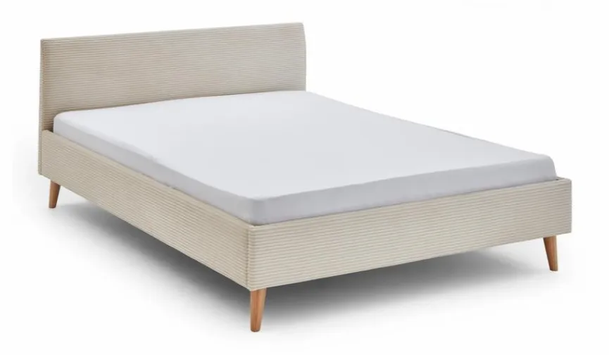 - Bettgestell aus Holzwerkstoff, Füße aus massivem Gummibaumholz in eichefarbig, Bezug Cord-Stoff in beige