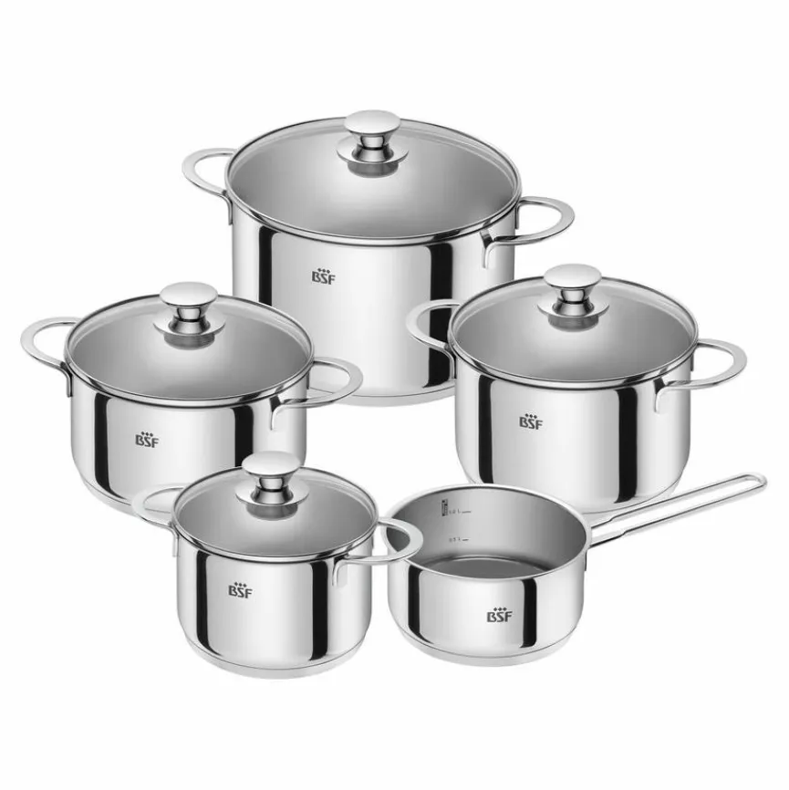 - Artikel beinhaltet je 1x Kochtopf Ø 16 cm (2l), Ø 20 cm (3,5l), Ø 24 cm (6l), Bratentopf Ø 20 cm (3l) je mit Glasdeckel und 1x Stielkasserolle Ø 16 cm (1,5l) ohne Deckel