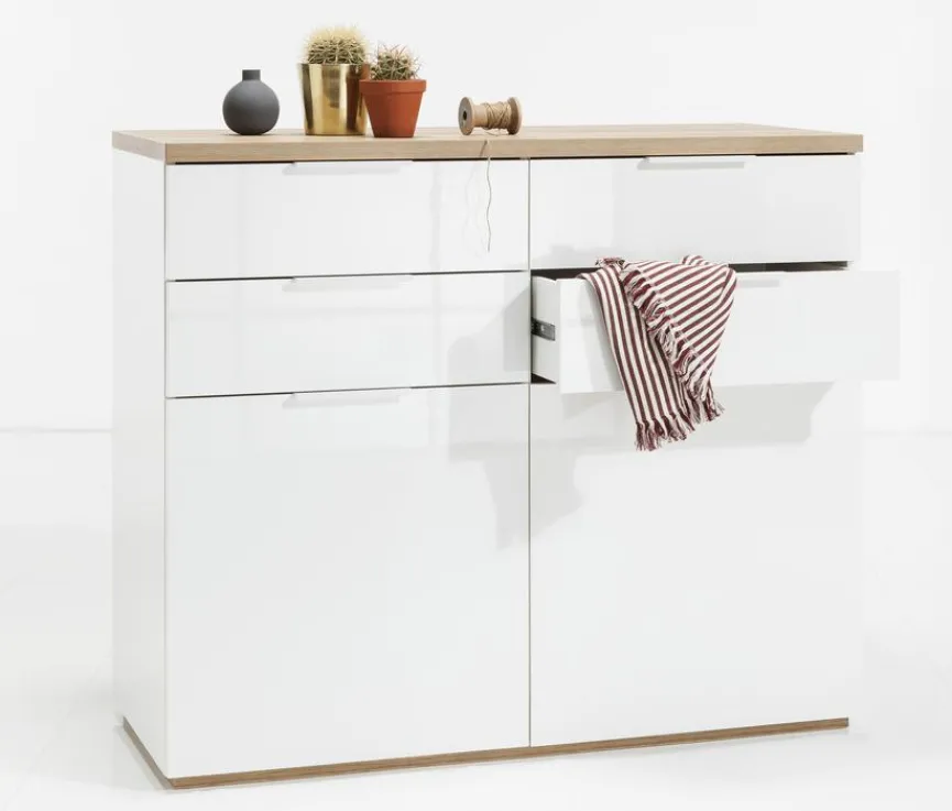 Die Kommode Mundi der Marke Composad ist nicht nur funktionell, sondern ein echtes Designerstück. Mit der weißen Hochglanzlackierung und der kontrastierenden Abdeckplatte erhält das Möbel ein attraktives und modernes Design. Darüber hinaus bietet die Kommode Mundi von Composad viel Stauraum für verschiedene kleinere Gegenstände.