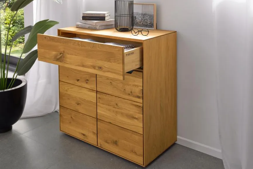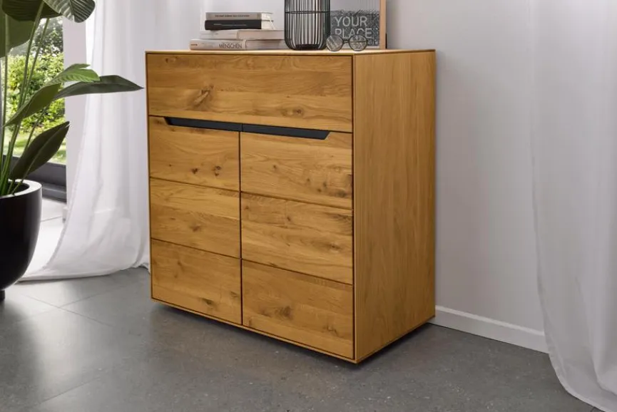Bei der Kommode Onema aus dem Hause DECKER handelt es sich zweifellos um einen echten Blickfänger. Vor allem dank der Verarbeitung von Wildeiche samt attraktiven Ausfräsungen entsteht eine unwiderstehliche Optik. Mit zwei Türen und einem Schubkasten bietet Ihnen die Kommode Onema darüber hinaus jede Menge Platz, um etwa Kleidungsstücke oder andere Gegenstände sinnvoll sortiert unterzubringen.