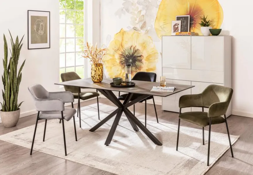 Mit dem Esstisch Star aus dem Hause BOOOM erhalten Sie eine optisch ansprechende Bereicherung für Ihre Einrichtung. Der Esszimmertisch fällt vor allem dank seiner Keramikplatte sofort positiv auf. Außerdem bietet Ihnen der Esstisch Star ein belastbares Vierbein-Gestell aus Metall.