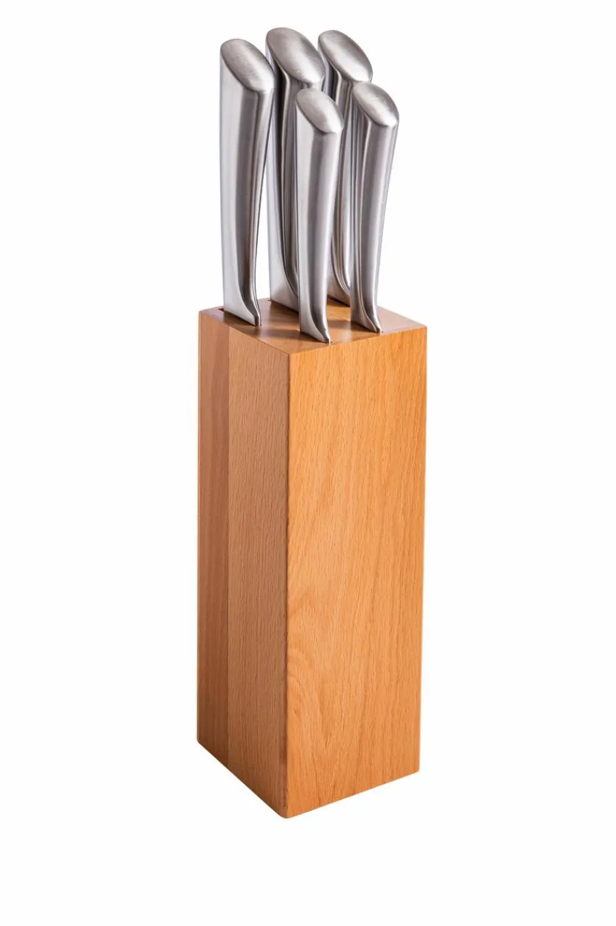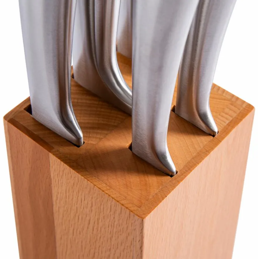 Der praktische und ästhetisch gestaltete, natürlich gemaserte Messerblock 6tlg. stellt eine gute Möglichkeit dar, die scharfen Schnittwerkzeuge geschützt und griffbereit unterzubringen. In optischer Hinsicht sorgt das Utensil für ein aufgeräumtes Ambiente. Ein weiterer Vorteil besteht darin, dass die Klingen der Küchenhelfer im Messerblock 6tlg. geschont werden.