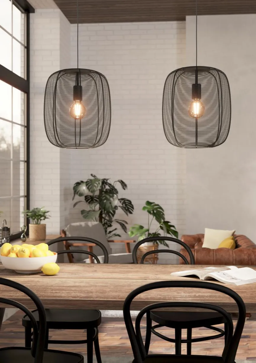 Mit der Pendelleuchte Rinroe aus dem Hause EGLO zaubern Sie faszinierende Licht- und Schatteneffekte an Decke und Wände Ihrer Räumlichkeiten. Grund dafür ist die Ausführung der Lampenschirme der Pendellampe aus gewickelten Drahtgittern. Die Pendelleuchte Rinroe passt ausgezeichnet zu modernen Einrichtungsstilen, macht aber auch im Vintagebereich eine gute Figur.