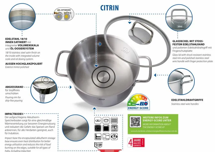 Der Fleischtopf Citrin 24 cm der Marke ELO besticht durch hochwertiges Material und seine Verarbeitung sowie durch seine praktische Größe. Er besteht aus hochwertigem Edelstahl und ist ein allseits beliebtes Accessoire in der Küche. Mit dem Fleischtopf Citrin 24 cm der deutschen Tradtionsmarke ELO werden Sie viel Freude haben und finden mit diesem den optimalen Partner zum Kochen Ihres Lieblingsgerichts.