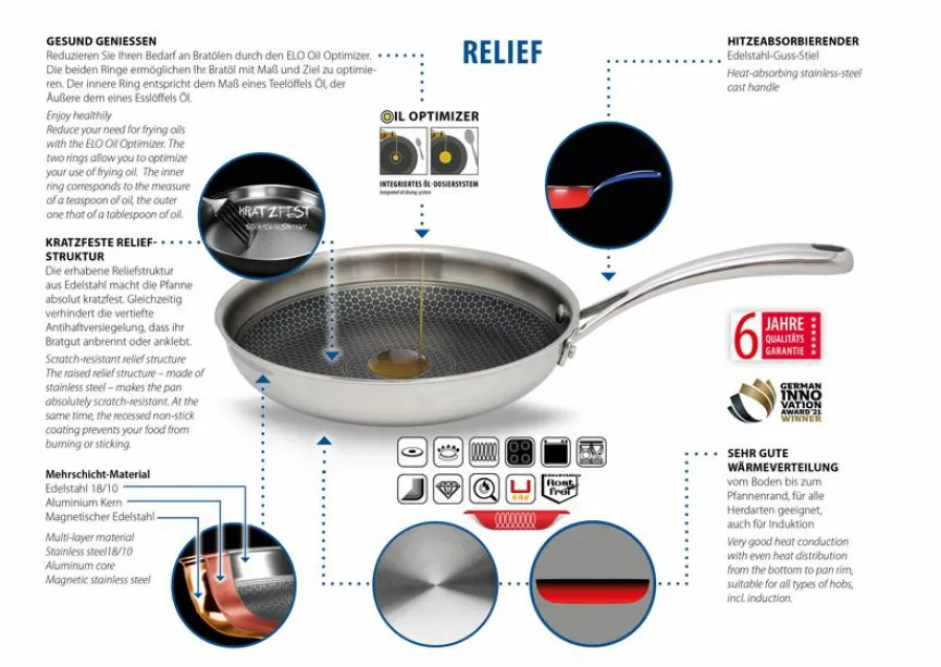 Mit der Bratpfanne Relief Evolution Ø 28 cm der Marke ELO sind Sie bestens in Ihrer Küche ausgestattet. Das Bratgeschirr begeistert Hobbyköche und Profis gleichermaßen mit dem kratzfesten Wabenboden und der Antihaftbeschichtung Elodur Professional. Dank der Bratpfanne Relief Evolution Ø 28 cm gelingen auch Speisen ausgezeichnet, die eine hohe Brattemperatur erfordern.