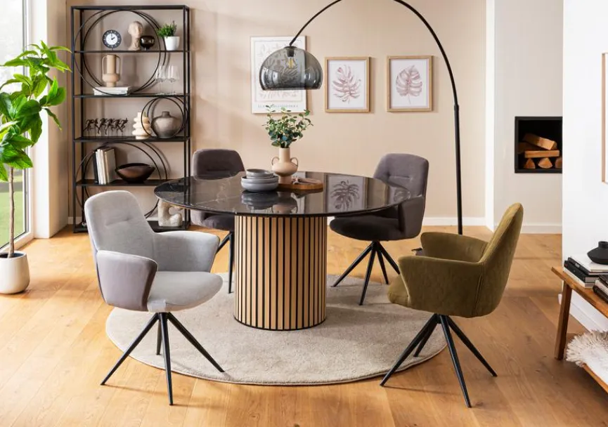 In stilvollen Interieurs liefert der attraktive Esstisch Dash Ø 150 cm die besten Voraussetzungen für gemütlich eingenommene Mahlzeiten oder für unterhaltsame Gesprächsrunden. Die gelungene Materialkombination aus glänzenden und matten Elementen verleiht dem harmonisch geformten Esszimmertisch das gewisse Etwas und setzt aparte Akzente. Als optisch ansprechender Treffpunkt bereichert der Esstisch Dash Ø 150 cm jedes Zuhause.