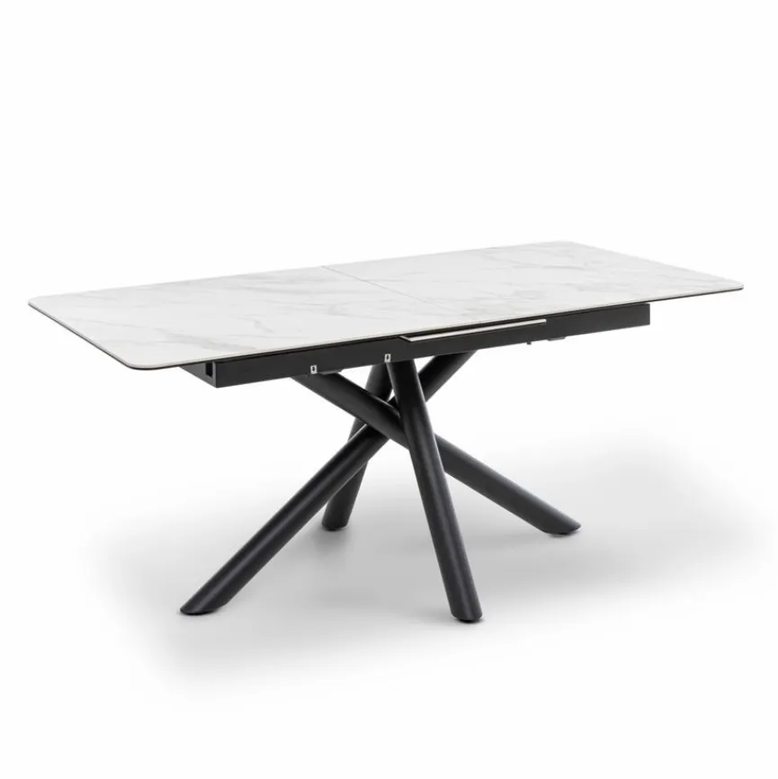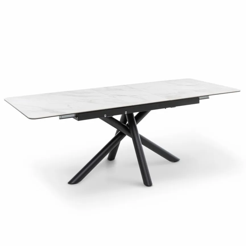 Der Esstisch mit Auszug Bayonne 180/220×90 cm ist wie geschaffen dafür, den Mittelpunkt Ihres Speisebereichs zu bilden. Besonders gefällt der Esszimmertisch mit seinem asymmetrischen Sternengestell und dem Kontrast aus heller marmorierter Platte und dunklen Tischbeinen. Versammeln Sie sich mit lieben Menschen um den Esstisch mit Auszug Bayonne 180/220×90 cm und genießen Sie geselliges Miteinander.