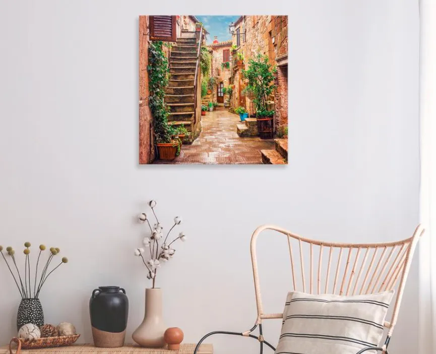 Mit dem Wandbild 55×55 cm Tuscan Ambience II von EUROART holen Sie sich die Stimmung des Südens in die eigenen vier Wände. Das hochwertige Deko Bild passt mit seinem zeitlos schönen Motiv in jede Wohnumgebung. Hängen Sie das Wandbild 55×55 cm Tuscan Ambience II einfach und schnell direkt an der Leinwand auf.