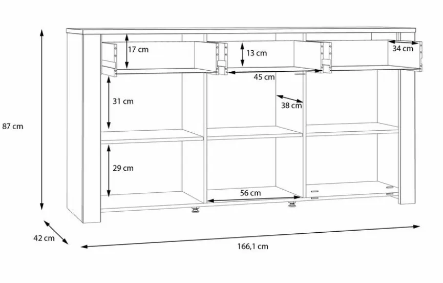 - Mit 3 Türen, 3 Böden und 3 Schubkästen