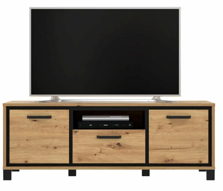 - Korpus und Front aus Holzwerkstoff mit hochwertiger Dekorfolie in Artisan Eiche kombiniert mit Eiche in schwarz, Griffe und Füße aus Metall in schwarz