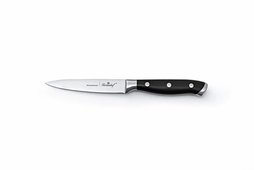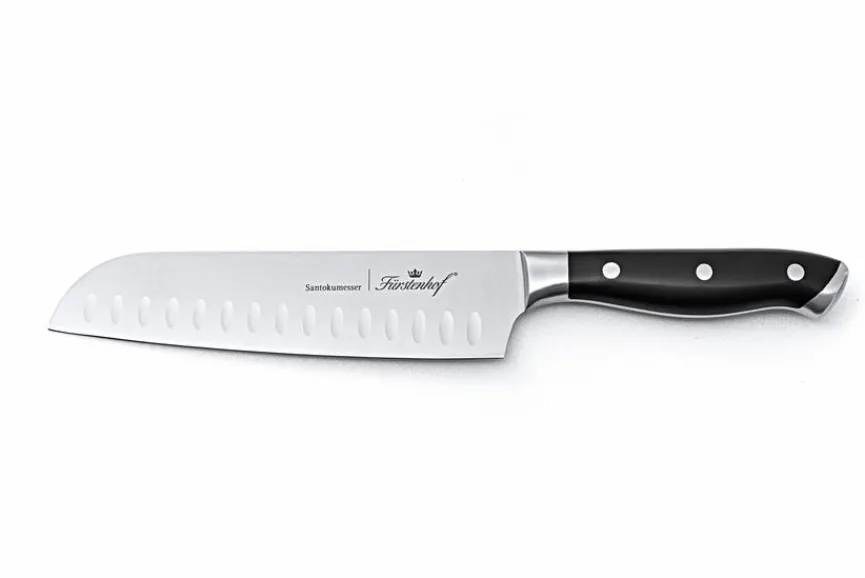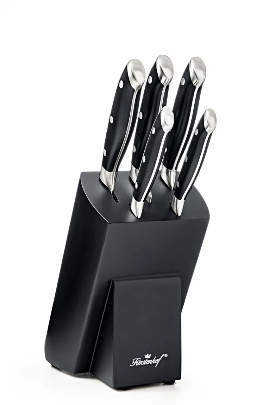 - Artikel beinhaltet je 1x Kochmesser 20,5 cm, Brotmesser 20,5 cm, Santokumesser 18,5 cm, Allzweckmesser 11 cm, Schälmesser 9 cm und Messerblock schwarz lackiert
