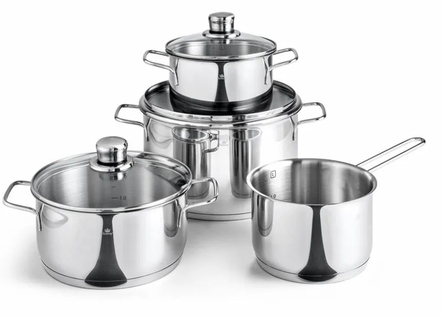 - Artikel beinhaltet je 1x Kochtopf Ø 16 cm, Ø 20 cm, Ø 24 cm, Bratentopf Ø 20 cm, jeweils mit Glasdeckel und Stielkasserolle Ø 16 cm ohne Deckel