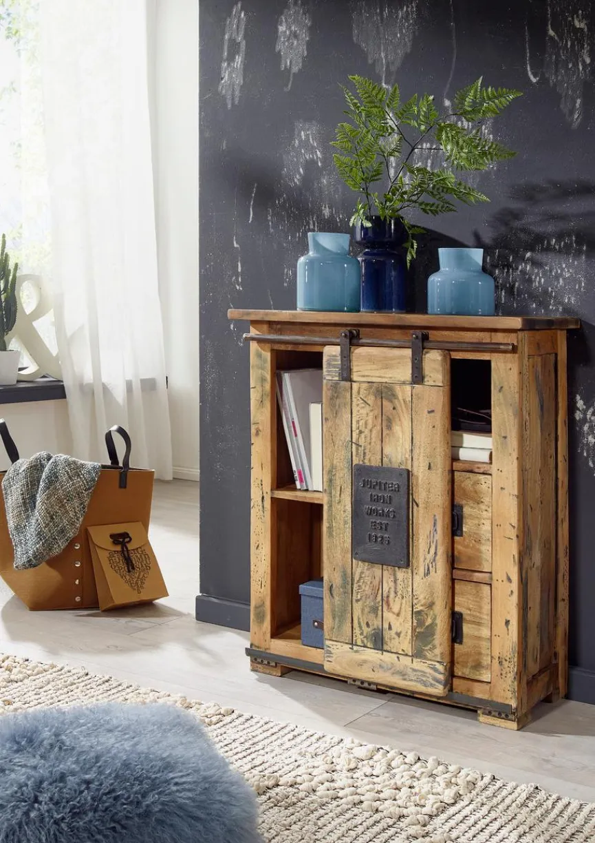 Mit dem hochwertigen Sideboard Railway holen Sie sich ein echtes Schmuckstück nach Hause. Die Kommode in Altholz-Optik verfügt über eine Rolltür sowie über zwei Schubkasten und ist mit Türapplikationen aus Gusseisen verziert. Zudem bietet das Sideboard Railway genügend Platz zum Verstauen Ihrer Lieblingsutensilien.