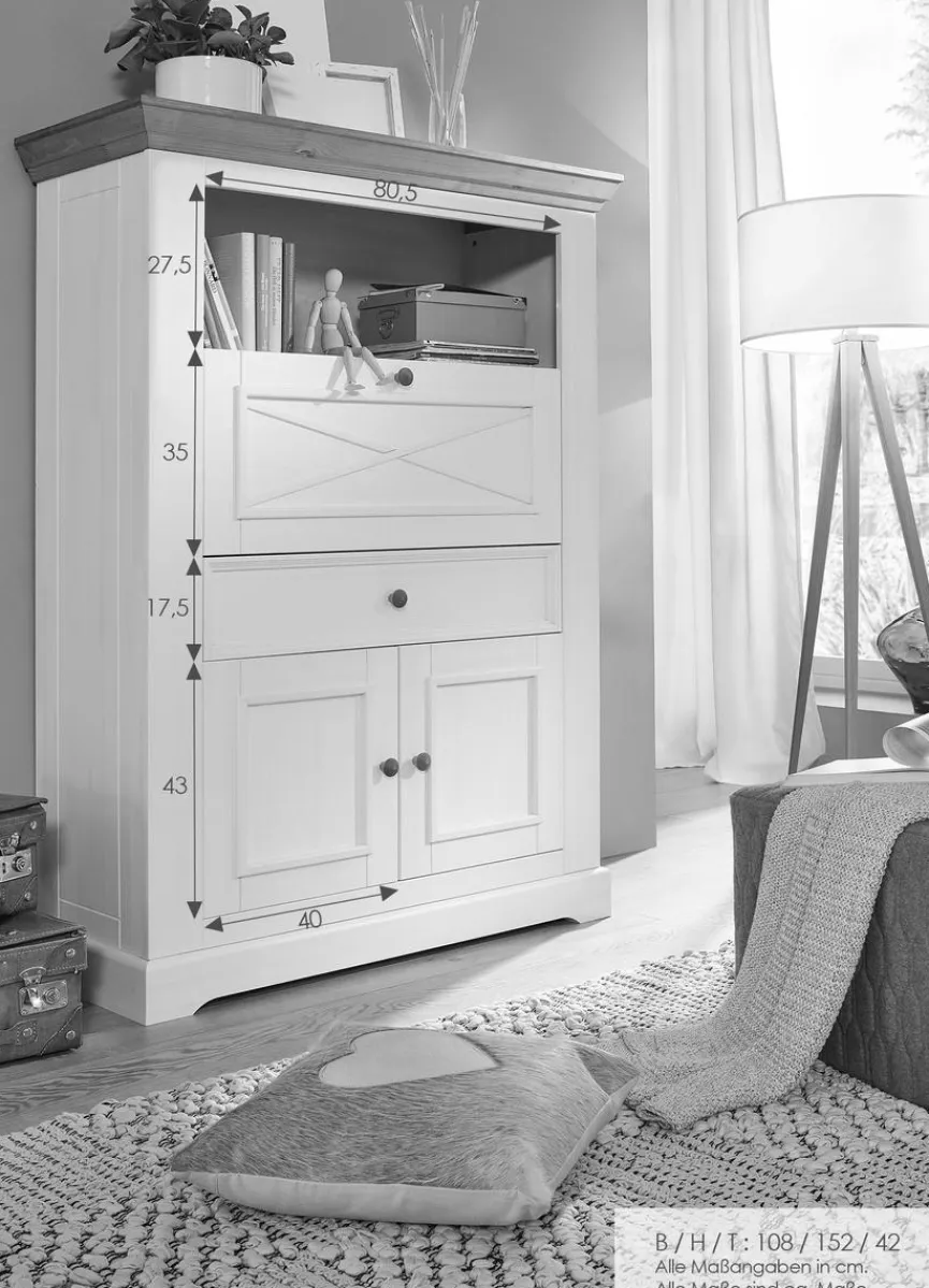 Der Sekretär Minnesota präsentiert sich in einem schicken Design im Landhaus-Stil. Die Optik der Kommode wird durch die geschmackvolle Formgebung und die farblich abgesetzte Abdeckplatte bestimmt. Darüber hinaus bietet das Sekretär in vielen verschiedenen Fächern ausreichend Stauraum für die Aufbewahrung diverser Gegenstände.