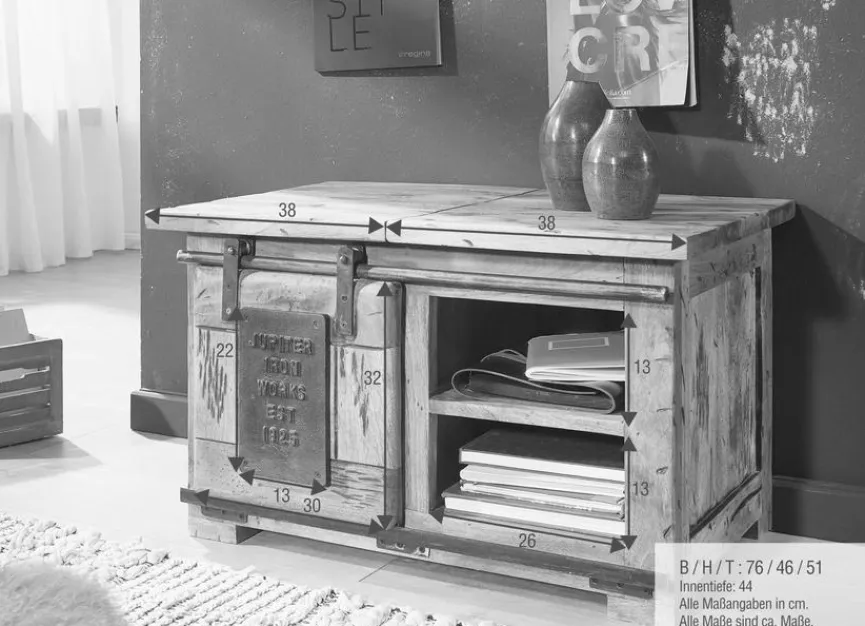 Setzen Sie mit dem TV-Lowboard Railway einen urigen Akzent. Markante Beschläge und Schienen verleihen diesem mit einer Rolltür und zwei offenen Fächern ausgestatteten TV-Unterschrank einen ausgesprochen charaktervollen Look. Besonders gut passt das TV-Lowboard Railway zu rustikalen Holzeinrichtungen, aber auch wunderbar zu Möbeln im rauen Industrial-Style.
