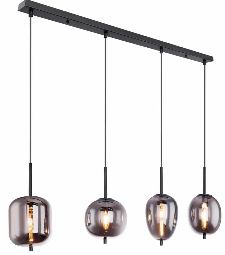 Die Pendelleuchte Blacky aus dem Hause Globo kombiniert mit ihren vier unterschiedlichen Rauchglasschirmen eine bekannte Stilidee mit frischem Design. So sieht die moderne Interpretation eines Klassikers unter den Pendellampen aus! Bestückt mit zeitgemäßen Leuchtmitteln von maximal 40 Watt wirft die Pendelleuchte Blacky von Globo ein attraktives Licht und zieht immer wieder die Blicke auf sich.