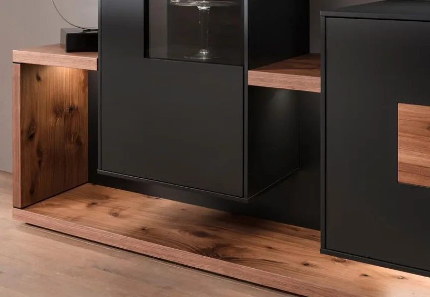 - Wohnwand besteht aus Unterbau, Vitrine, Lowboard und Wandboard