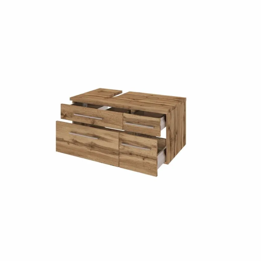 Mit dem Waschbeckenschrank Davos ist es ein Leichtes im Badezimmer für Ordnung zu sorgen. Das Möbel ist mit je zwei Schubkästen und Auszügen ausgestattet und schafft dadurch genug Stauraum für Bad- und Kosmetikutensilien. Neben seiner Funktionalität kann der Waschbeckenunterschrank Davos auch mit seinem Design auf ganzer Linie punkten.