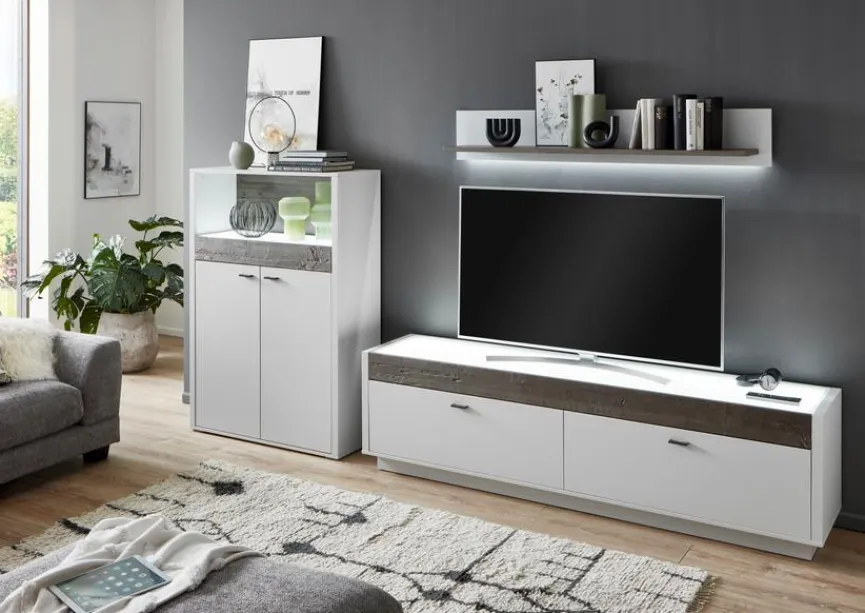 - Korpus aus Holzwerkstoff (Spanplatte) mit kratzfester Melaminharzfolie in „Modern White“, Front aus Holzwerkstoff (MDF) mit hochwertiger Dekorfolie in „Modern White“, Front-Absetzung in Kastanie Echtholz furniert, Sichtbare Rückwände in Vulcano glatt