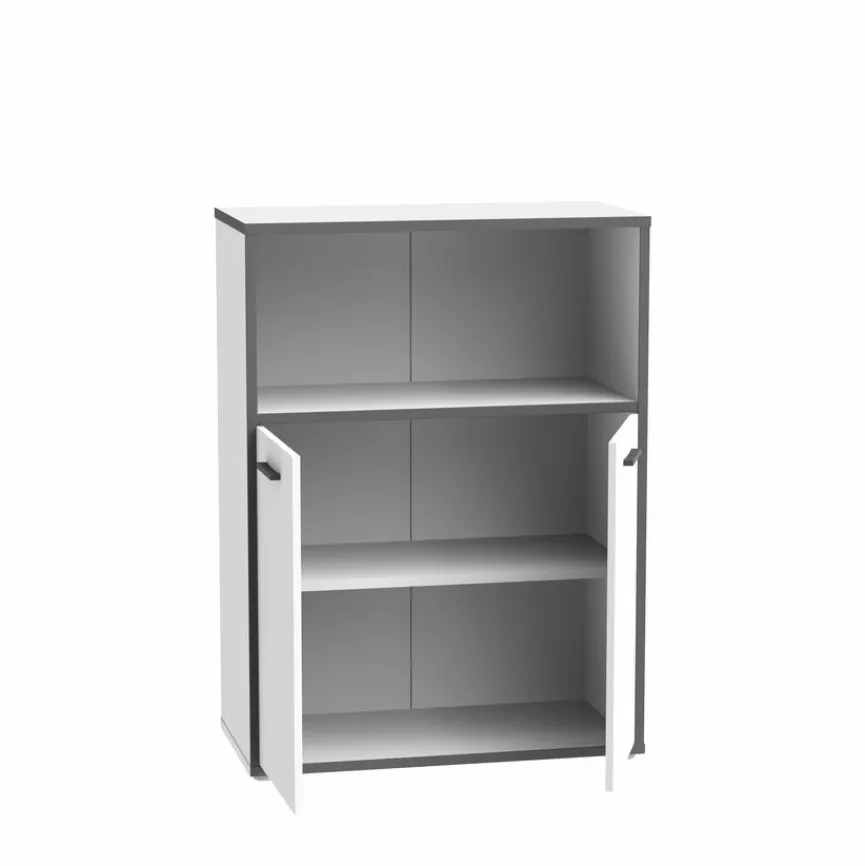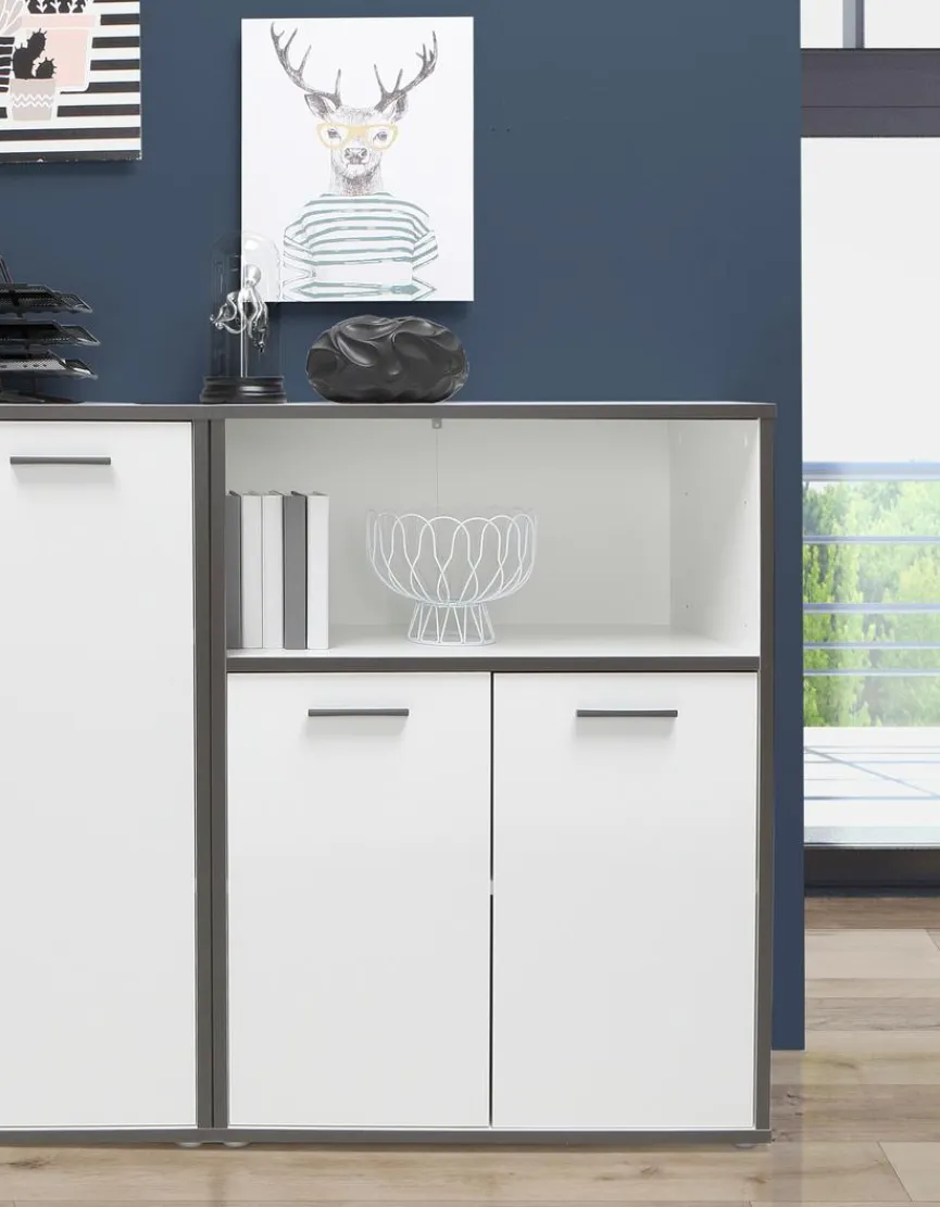 - Aus Holzwerkstoff (Spanplatte) in Weiß, Kontrastkante aus Holzwerkstoff (Spanplatte) in Uni Wolfram Grau, Rückwand aus Holzwerkstoff (HDF-Platte) in Weiß, Griffe aus Kunststoff in Grau