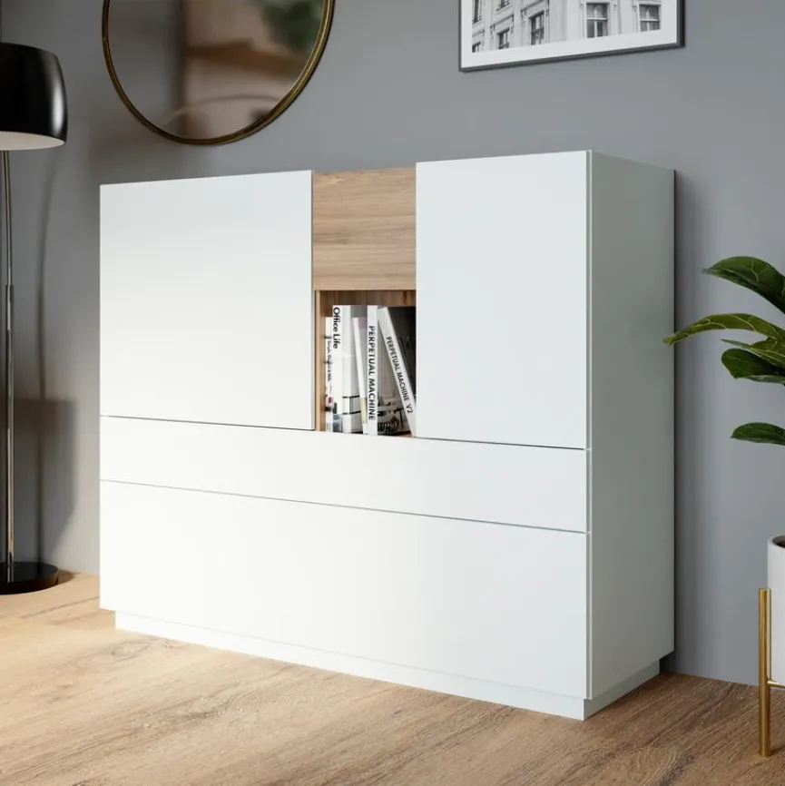- Mit 2 Türen, 2 Schubkästen, 1 Klappe und 1 offenen Fach