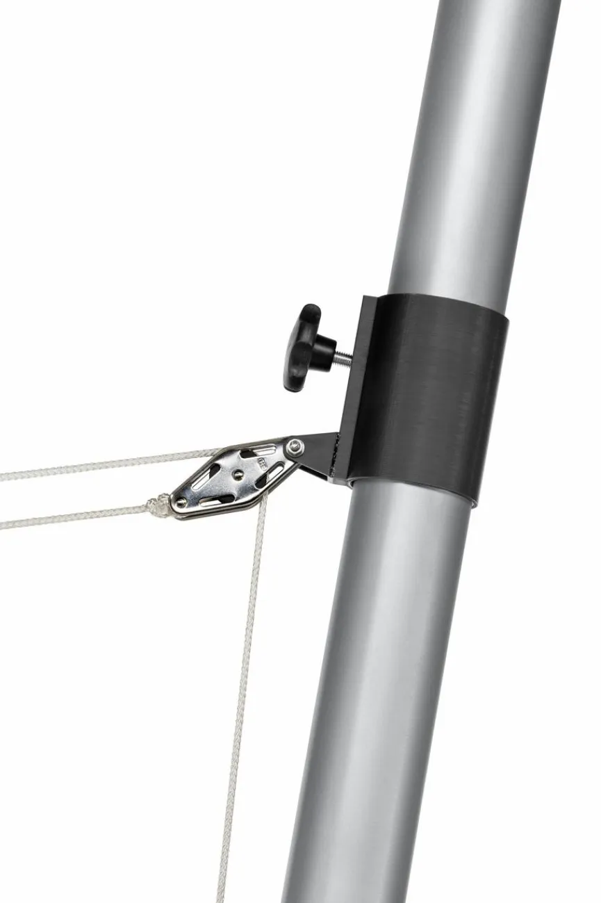 - inkl. Flaschenzug mit 5 m Befestigungsseil, Karabinerhaken, inkl. Seilklemme und Klampe