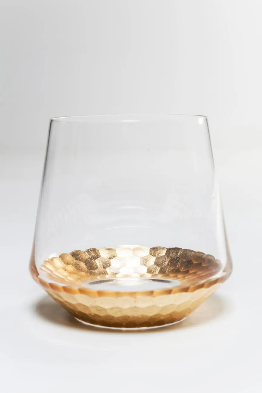 Ein visuell ansprechendes Trinkerlebnis bietet das Wasserglas Gobi – der Boden des klaren Glases besteht aus wabenförmigen Goldplättchen, welche im Glas sich widerspiegeln und einen edlen, sonnigen Farbton dem jeweiligen Getränk verleihen. Das Wasserglas Gobi (Höhe: 9 cm) ist beschichtet und nicht spülmaschinenfest, weshalb eine sorgfältige manuelle Reinigung nötig wird – das stört aber gerade bei diesem besonderen visuell-geschmacklichen Erlebnis nicht sonderlich.