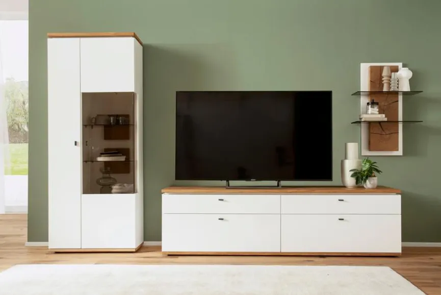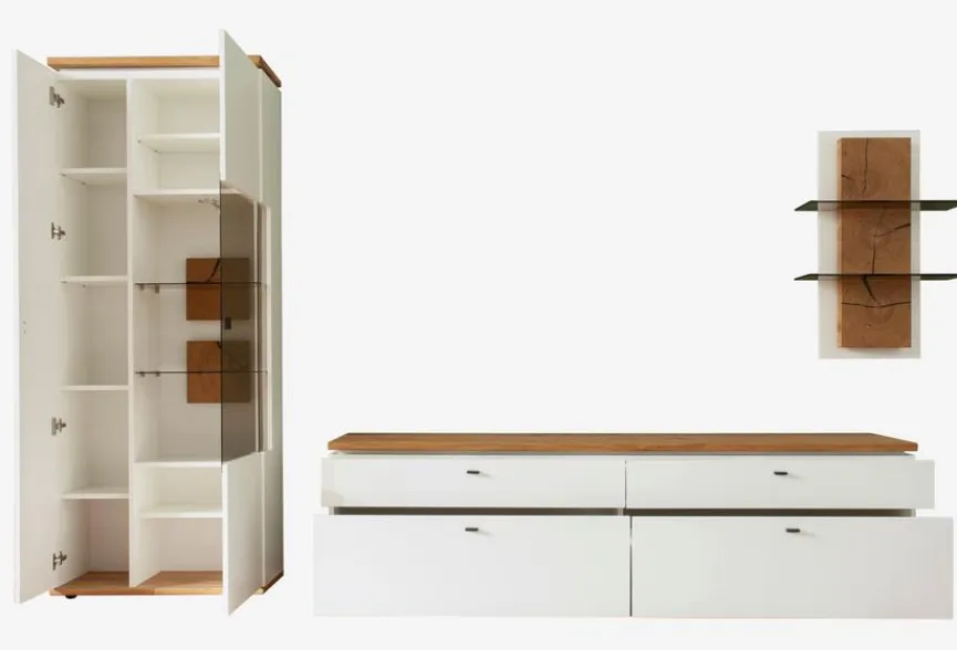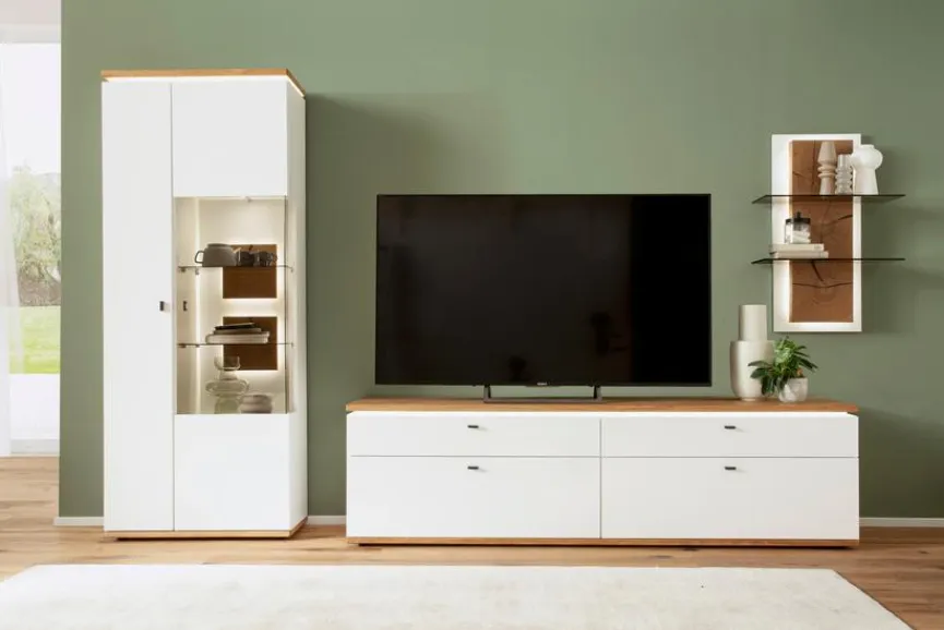 - Bestehend aus Vitrine, TV-Lowboard und Wandregal