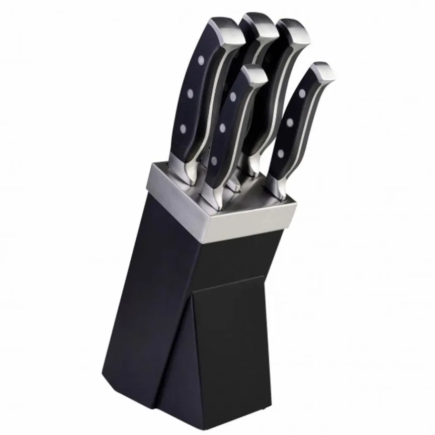 - Artikel beinhaltet je 1x Brotmesser 32,5 cm, Schinkenmesser 32,5 cm, Kochmesser 33 cm, Universalmesser 23,5 cm, Küchenmesser 19,5 cm und Messerblock mit Edelstahl-Applikationen