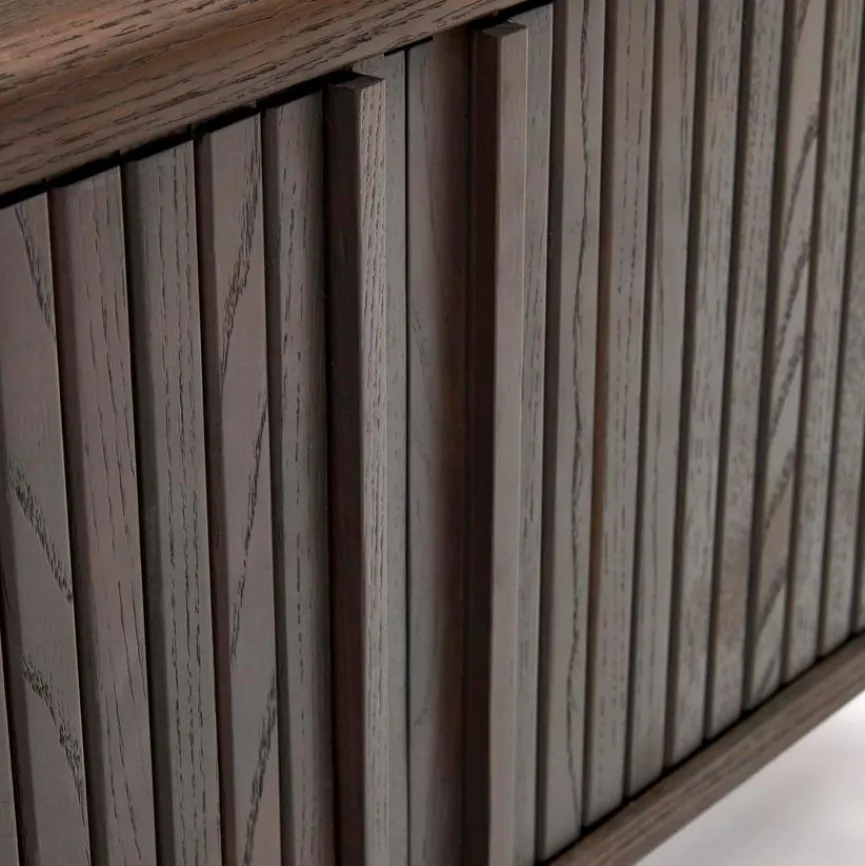 Das TV-Lowboard Mailen von Kave Home verkörpert sachlichen Chic, Extravaganz und Kreativität. Abgerundete Kanten und ein elegantes Lamellendesign, das an klassische Tambour-Rolladenmöbel denken lässt, machen diesen TV-Unterschrank zum Blickfang in Ihrem Zuhause. In einem bewusst schlicht gehaltenen Raum kann das TV-Lowboard Mailen zum Beispiel fantastisch wirken.