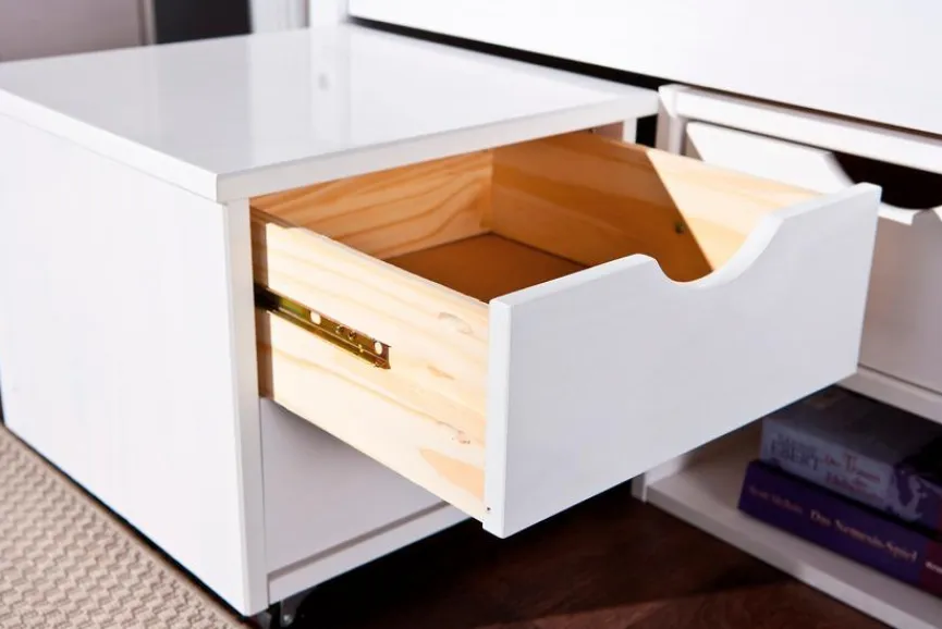 - Mit 1 großen Schublade auf Rollen, 2 Regalen mit je 1 offenen Fach und 1 Schubkasten und 1 Nachtkommode auf Rollen mit 2 Schubkästen