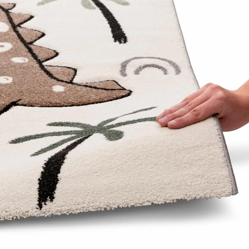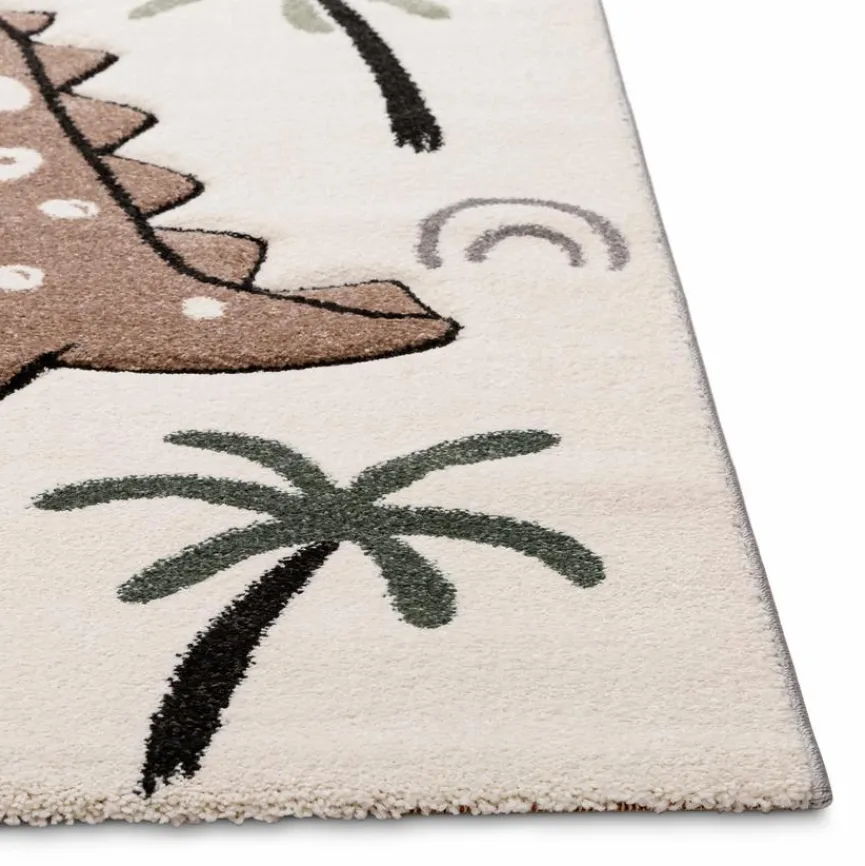Freundlich schmunzelnde Dinos und kleine Palmen schmücken den Kinderteppich Kids 133×190 cm, der für ein gemütliches Ambiente und gute Laune sorgt. Der angenehm weiche Kinderzimmerteppich schützt empfindliche Fußböden und dämmt den Trittschall. Außerdem lädt der Kinderteppich Kids 133×190 cm dazu ein, sich darauf niederzulassen und Bücher anzusehen oder um eine Ruhepause einzulegen.