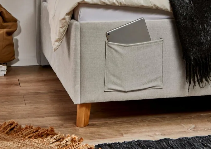 - Inkl. Kopfteil und Rückenelement jeweils mit umlaufender Biese und 2 Betttaschen