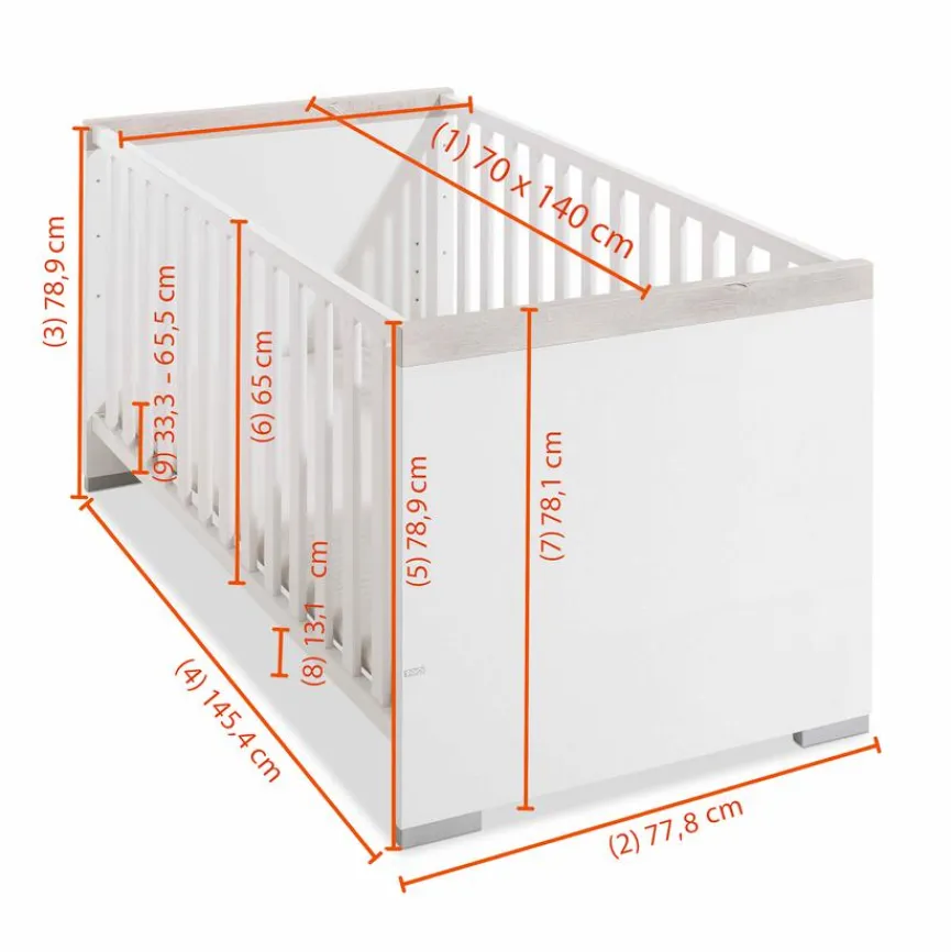 - Set besteht aus Babybett 70 x 140 cm, Wickelkommode BHT 135 x 90 x 56 cm, Wickelaufsatz BHT 135 x 10 x 78 cm und Kleiderschrank BHT 135 x 193 x 56 cm