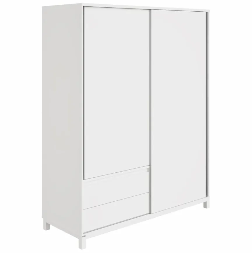 - Mit 2 Schiebetüren, 2 Schubkästen, 1 offener Schubkasten, 6 schmale Einlegeböoden, 1 breiten Einlegeboden und 2 Kleiderstangen