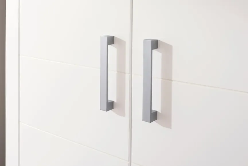 - Korpus aus Holzwerkstoff (Spanplatte) mit kratzfester Melaminharzfolie in kreideweiß, Front aus Holzwerkstoff (MDF) mit hochwertiger Dekorfolie in kreideweiß