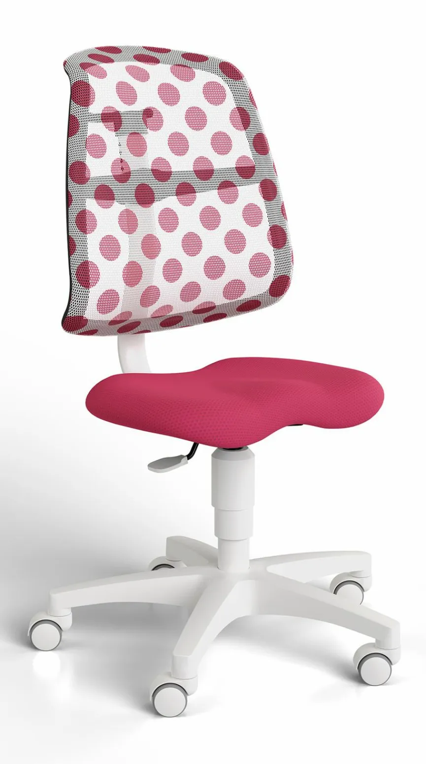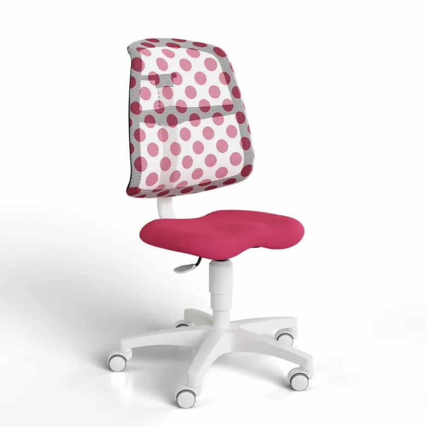 - Sitzbezug aus Stoff in brombeere, Rückenlehne mit atmungsaktivem Netzbezug in weiß mit Kreisen in brombeere
