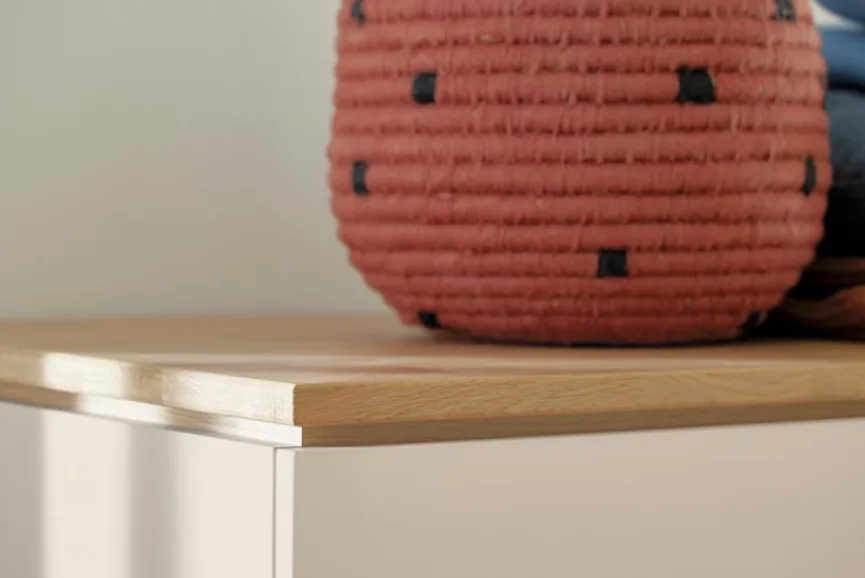 - Aus Holzwerkstoff (Spanplatte) mit kratzfester Melaminharzfolie in Cashmere-Beige, Füße, Griffe, Sockel und Deckplatte aus massiver Eiche