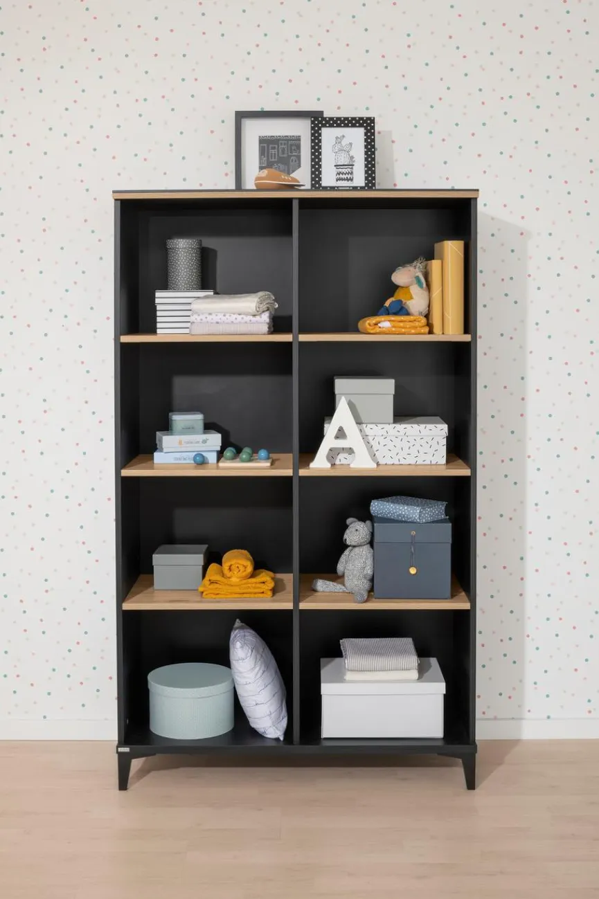- Aus Holzwerkstoff (Spanplatte) mit kratzfester Melaminharzfolie in Naturschwarz, Kontrastkante und Einlegeböden aus Holzwerkstoff (Spanplatte) mit kratzfester Melaminharzfolie in Eiche-Bordeaux-Nachbildung