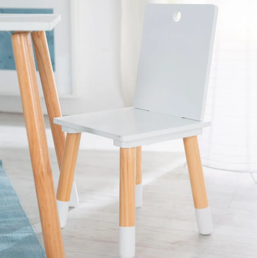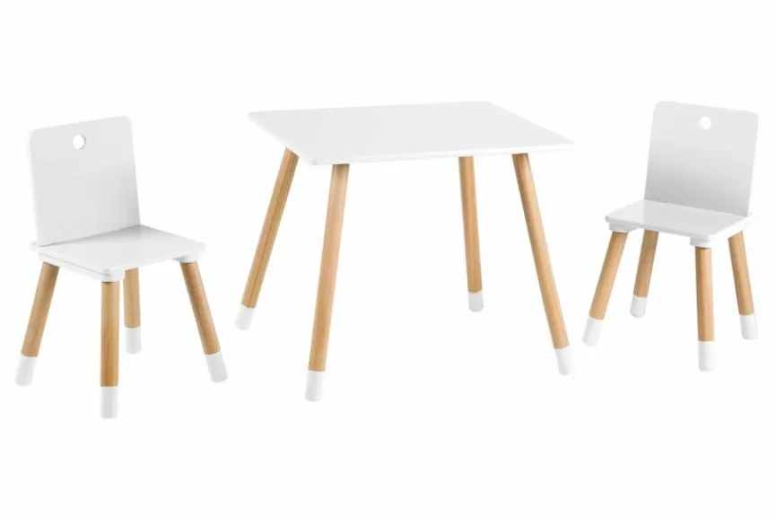 - Tischplatte, Sitzfläche und Lehnen aus Holzwerkstoff (MDF) in weiß lackiert, Stuhl- und Tischbeine aus massiver Kiefer in natur lackiert