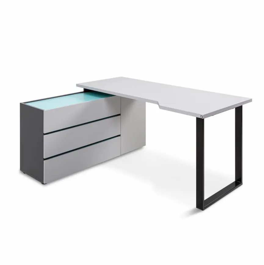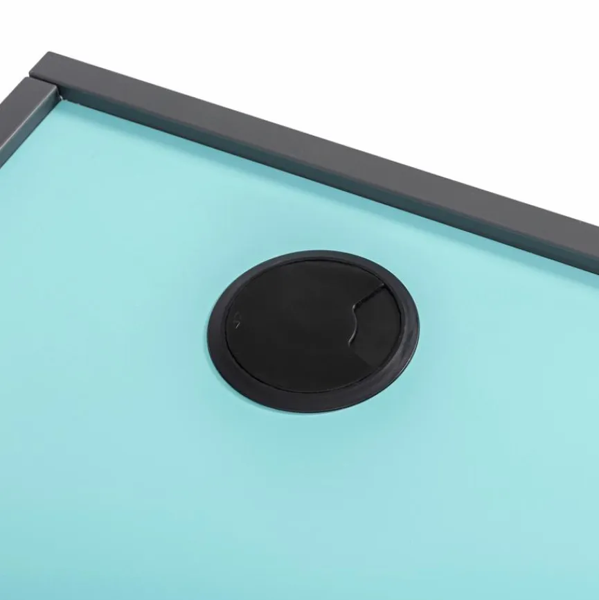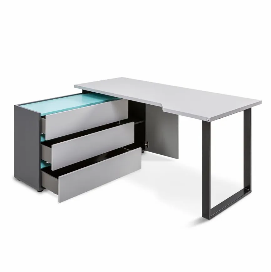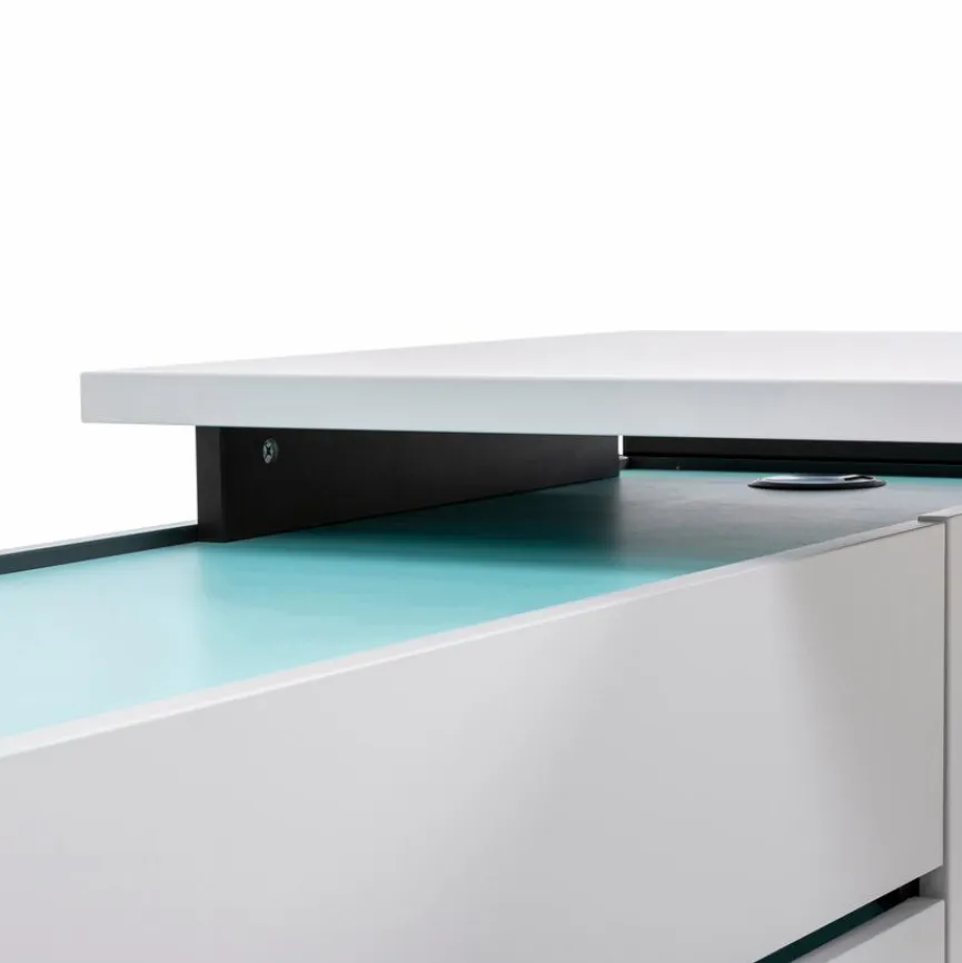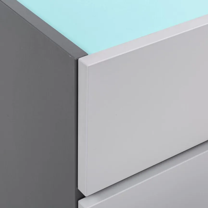 - Korpus des Sideboards aus Holzwerkstoff (Spanpatte) mit kratzfester Melaminharzfolie in Schiefergrau, Front/Platte aus Holzwerkstoff (Spanpatte) mit kratzfester Melaminharzfolie in Hellgrau, Absetzung aus Holzwerkstoff (Spanplatte) mit Lack in Türkis