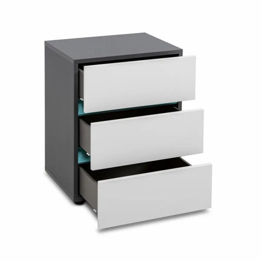 - Korpus aus Holzwerkstoff (Spanpatte) mit kratzfester Melaminharzfolie in Schiefergrau, Front aus Holzwerkstoff (Spanpatte) mit kratzfester Melaminharzfolie in Hellgrau, Absetzung aus Holzwerkstoff (Spanplatte) mit Lack in Türkis