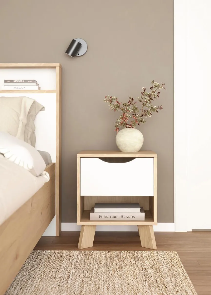 Der Nachttisch Ikast von Tvilum ist ein praktisches und gefällig gestaltetes Kleinmöbel für den Kinderzimmerbereich oder den Gästeraum. Gut anzusehen ist bei der Nachtkonsole die Mischung aus einfarbigem Bereich und edler Holzmaserung. Ins Auge fällt bei dem Nachttisch Ikast zudem die diagonale Anordnung der Standfüße.