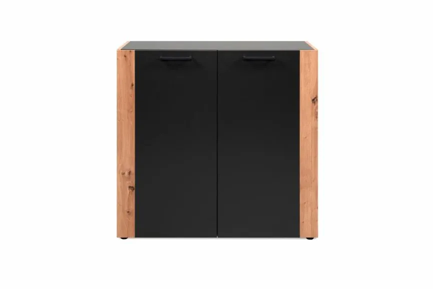 Die Kommode Cento überzeugt mit ihrer angesagten Kombination aus Holzoptik und tiefschwarzen Kontrastelementen, wodurch sie genau den Nerv der Zeit trifft. Hinter zwei Türen bietet sie Ihnen außerdem viel Stauraum für Nützliches und Liebgewonnenes und sorgt so für mehr Ordnung. Besonders gut passt die Kommode Cento zu trendbewussten und rustikalen Einrichtungskonzepten, wo sie sich mühelos einfügt.