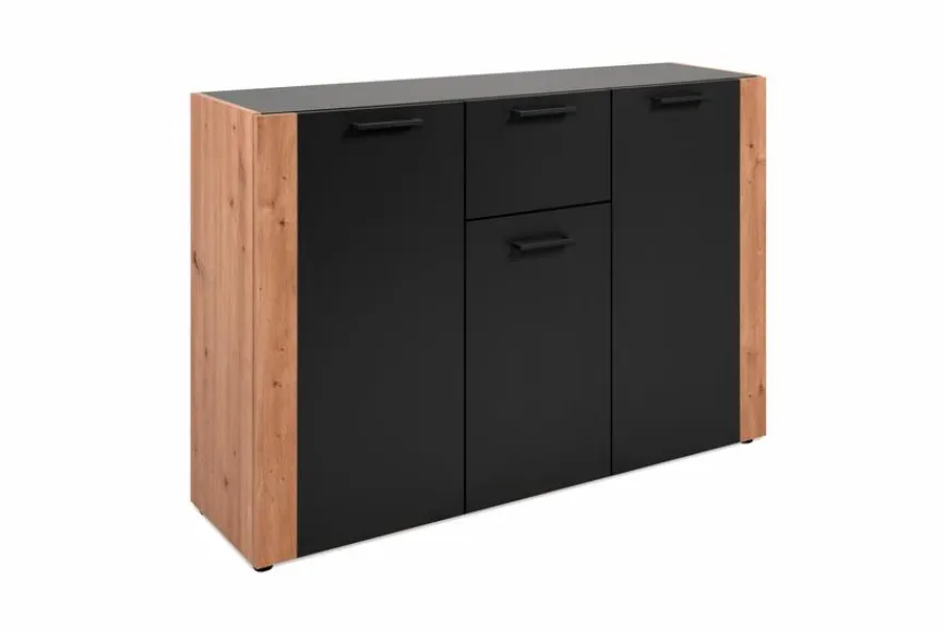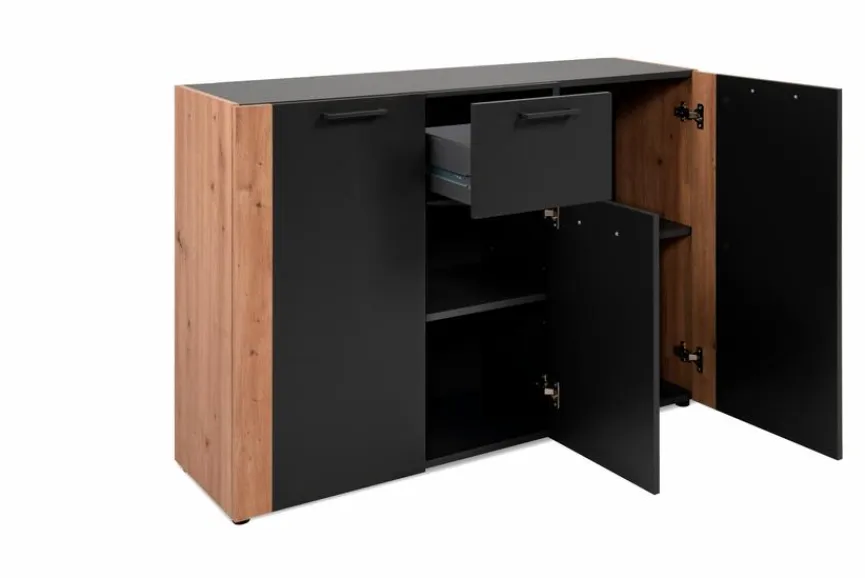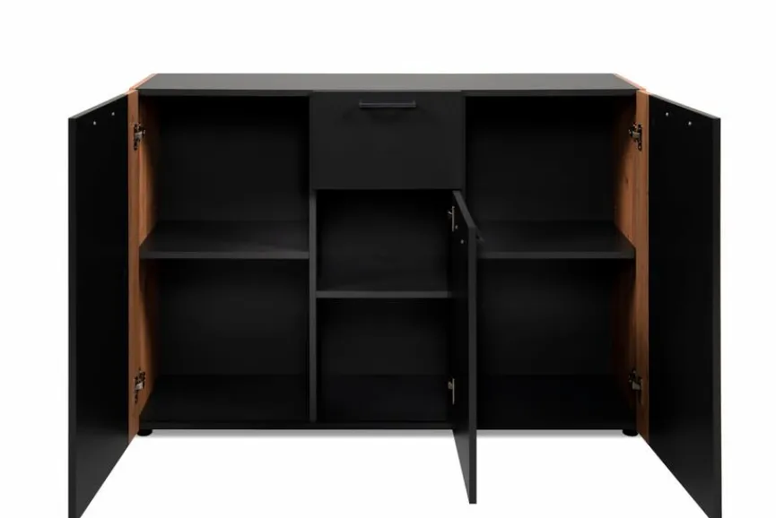 Mit der Kommode Cento verleihen Sie Ihren Wohnräumen etwas Besonderes, denn das trendige Design versprüht seinen ganz eigenen Charme. Dank der angesagten Kombination aus Holzoptik und tiefschwarzen Elementen trifft sie genau den Nerv der Zeit und wird mühelos zum Herzstück jedes Zimmers. Hinter drei Türen bietet Ihnen die Kommode Cento außerdem viel Platz für Nützliches und Liebgewonnenes.