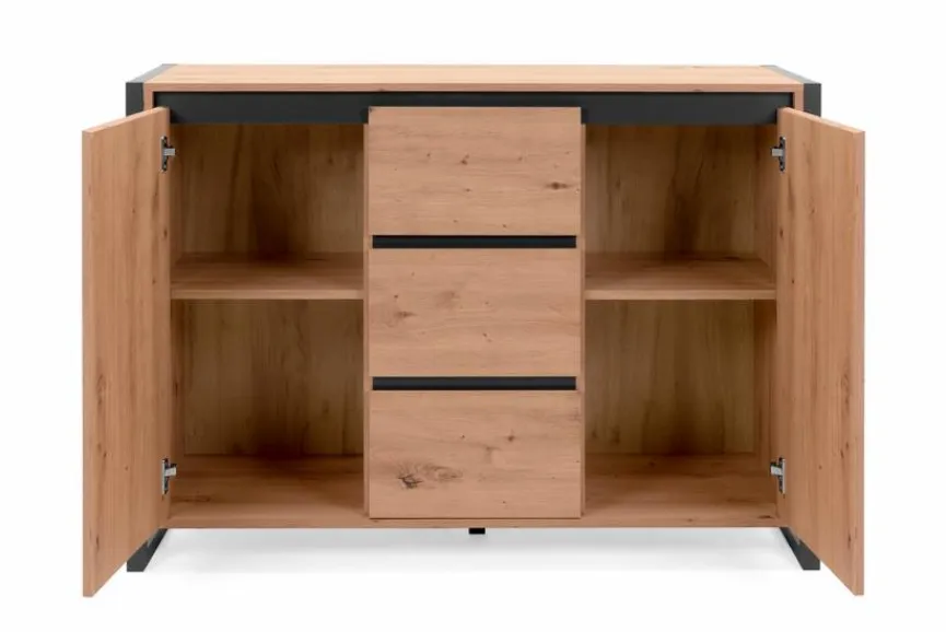 Die Kommode Denver weiß durch ihre klare Formensprache zu gefallen. Dank des attraktiven Holzdekors in Artisan Eiche vermittelt sie dem Raum einen Hauch Nostalgie. Unterstrichen wird dies von dem kontrastierenden Rahmen der Kommode Denver, die viel Platz für allerlei Utensilien bietet. Auch mit einem hübschen Dekorationsobjekt in Szene gesetzt wird sie zum Blickfang in jedem Raum.