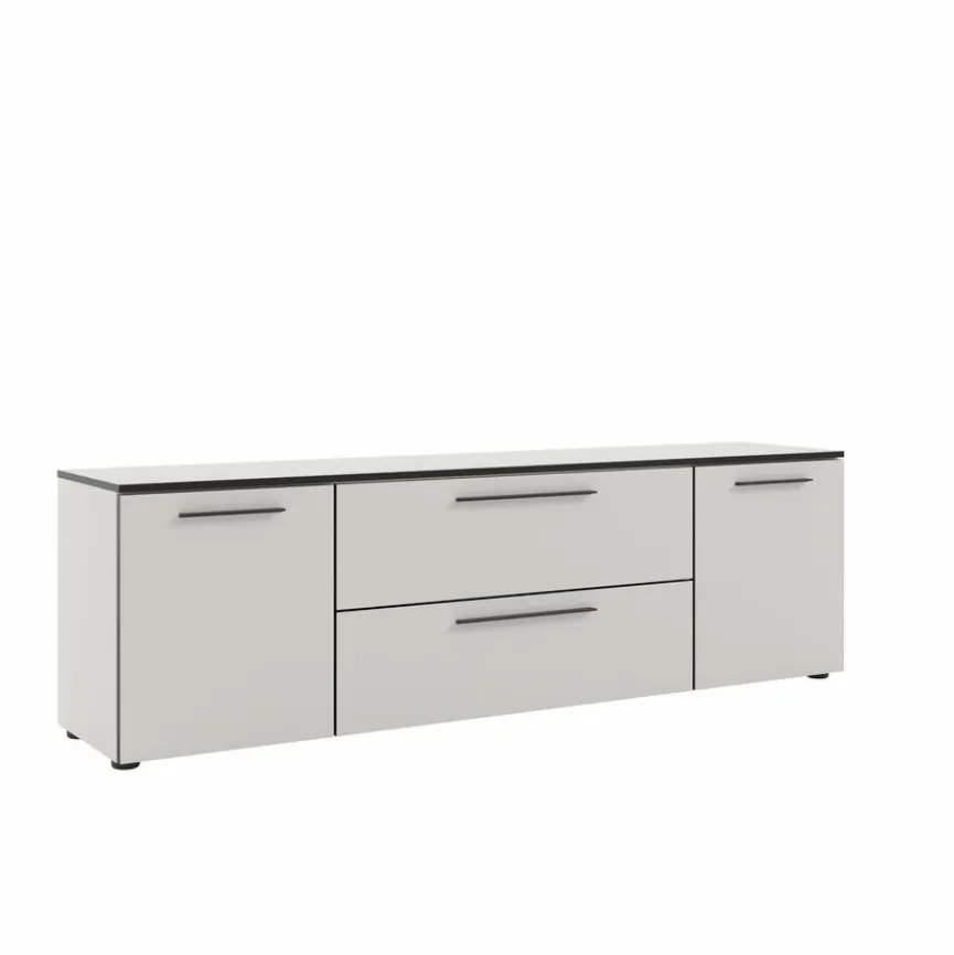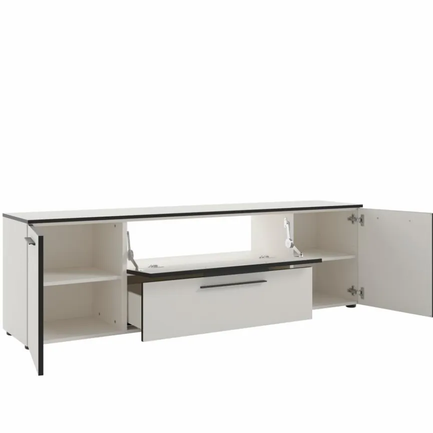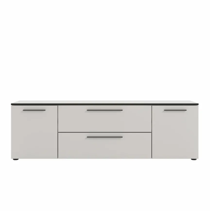 Das Lowboard Soul bietet hinter zwei Türen, einem Schubkasten und einer Klappe nützlichen Stauraum für Multimedia-Zubehör und andere Gegenstände. Seine Oberfläche hält Platz für den Fernseher bereit. Vier verstellbare Bodengleiter geben dem Lowboard Soul einen kippsicheren Stand. Das Sideboard ist mit schlanken Metallgriffen in horizontaler Ausrichtung ausgestattet, die das Öffnen der Fächer und Türen erleichtern.