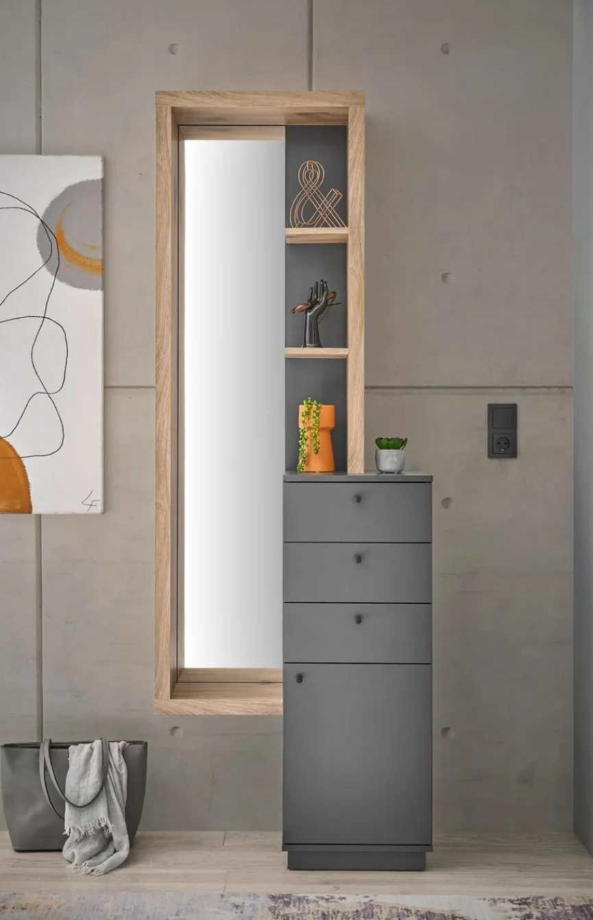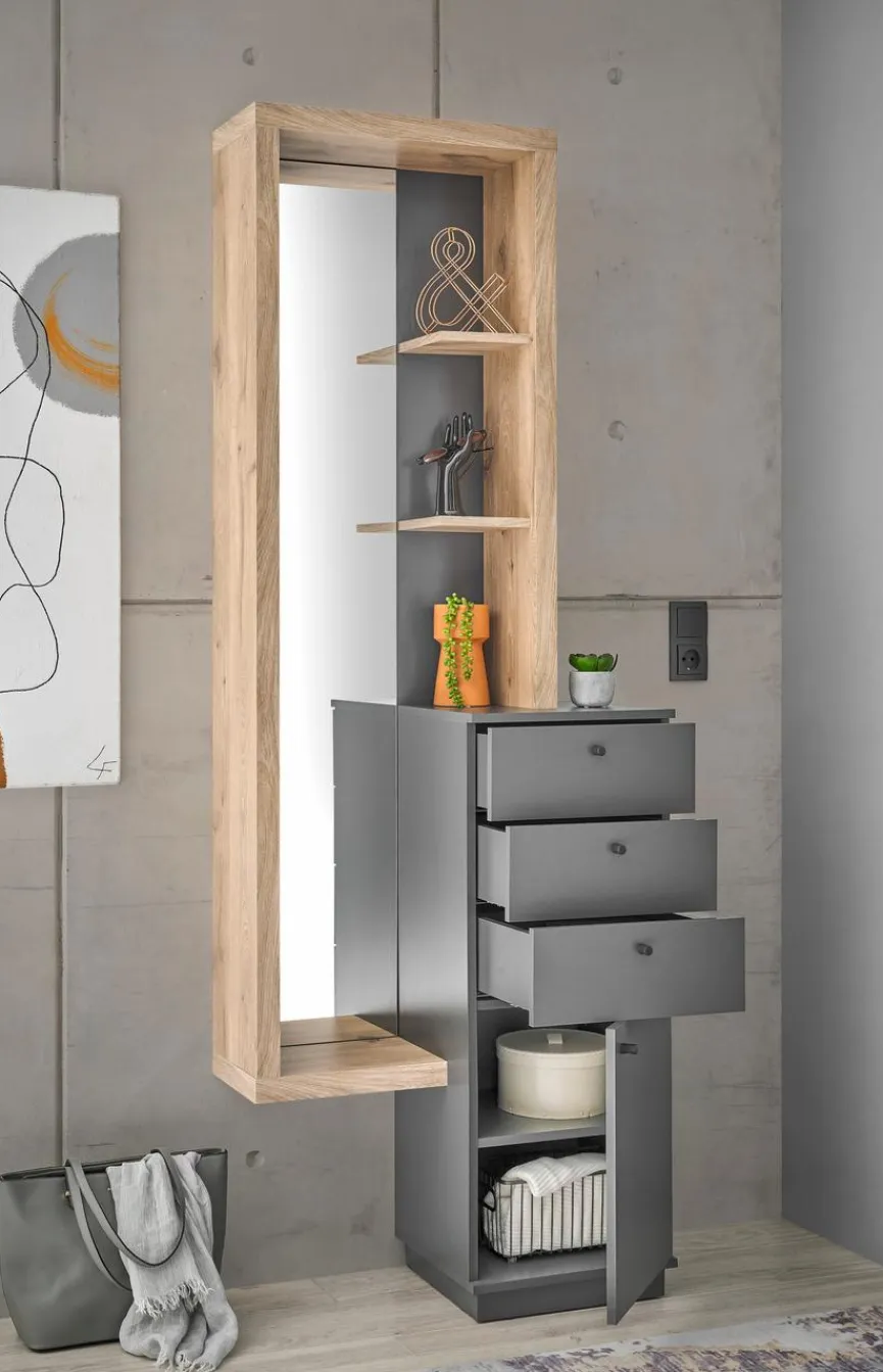 Mit einer interessanten Optik im sich überschneidenden Stil begeistert die Kompaktgarderobe Frame. Markieren Sie mit der trendigen Gaderobe und dem hohen Spiegel einen tollen Blickfang in Ihrem Eingangsbereich. Hinter einer Tür, in drei Schubladen sowie in den Regalböden wartet die Kompaktgarderobe Frame mit viel Platz für Kleidung, Schuhe, Accessoires oder zum Präsentieren schöner Dekostücke auf.